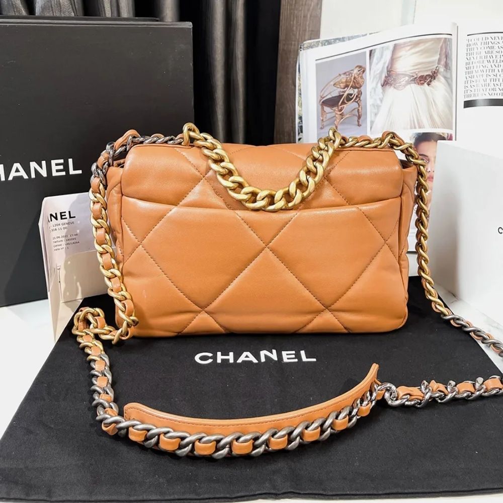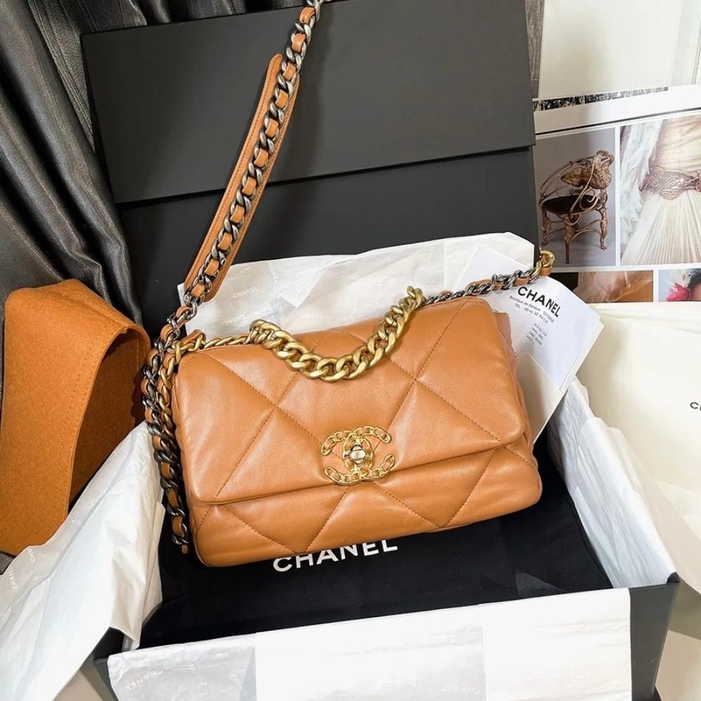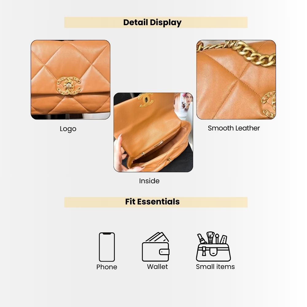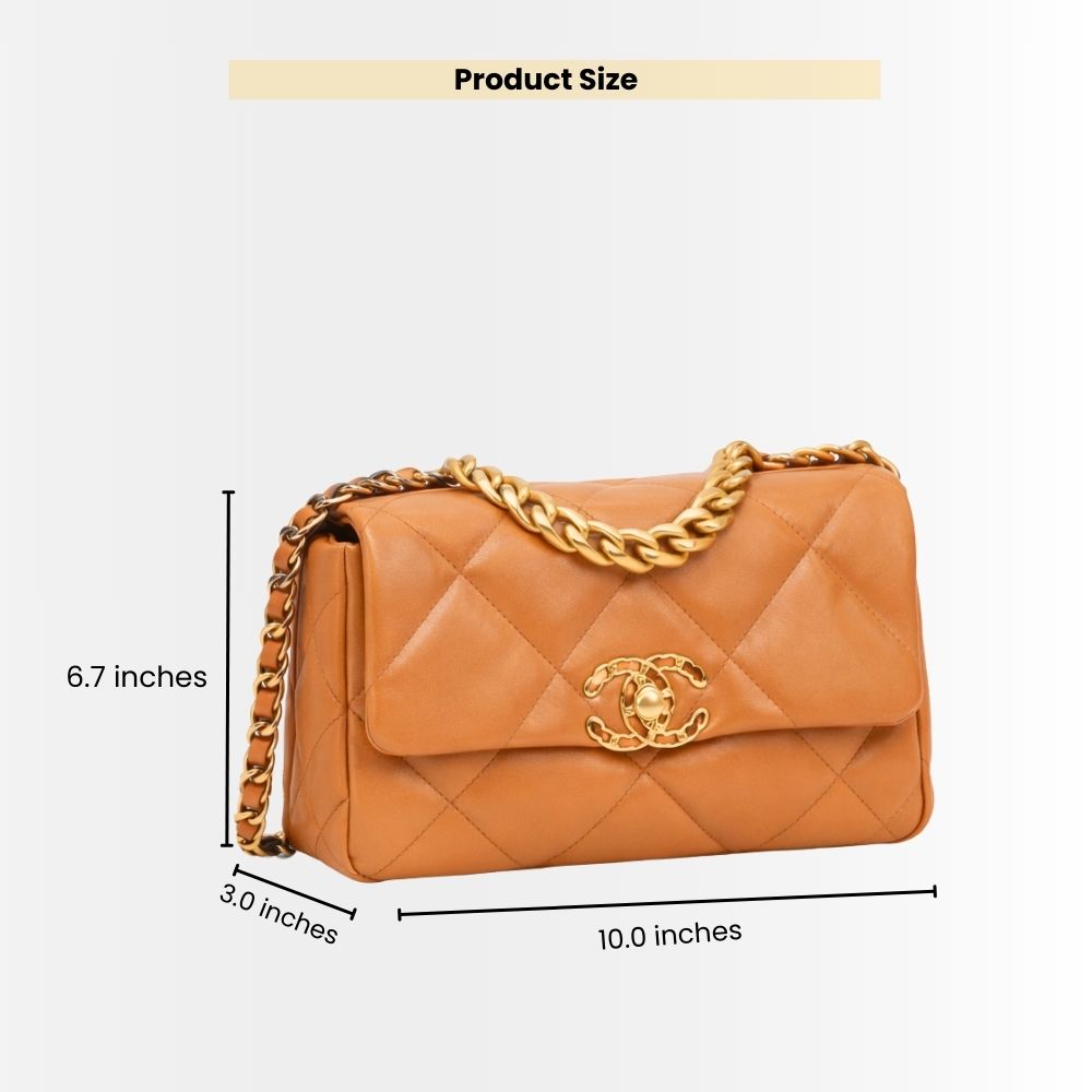 - The Chanel 19 Small Flap Bag in Caramel is a sophisticated piece crafted from supple caramel-toned leather. Featuring the iconic diamond quilting, oversized CC logo, and mixed metal chain, this 25cm bag perfectly balances modern style with timeless elegance.