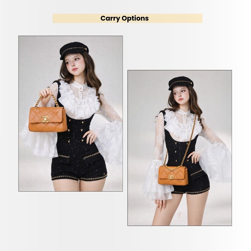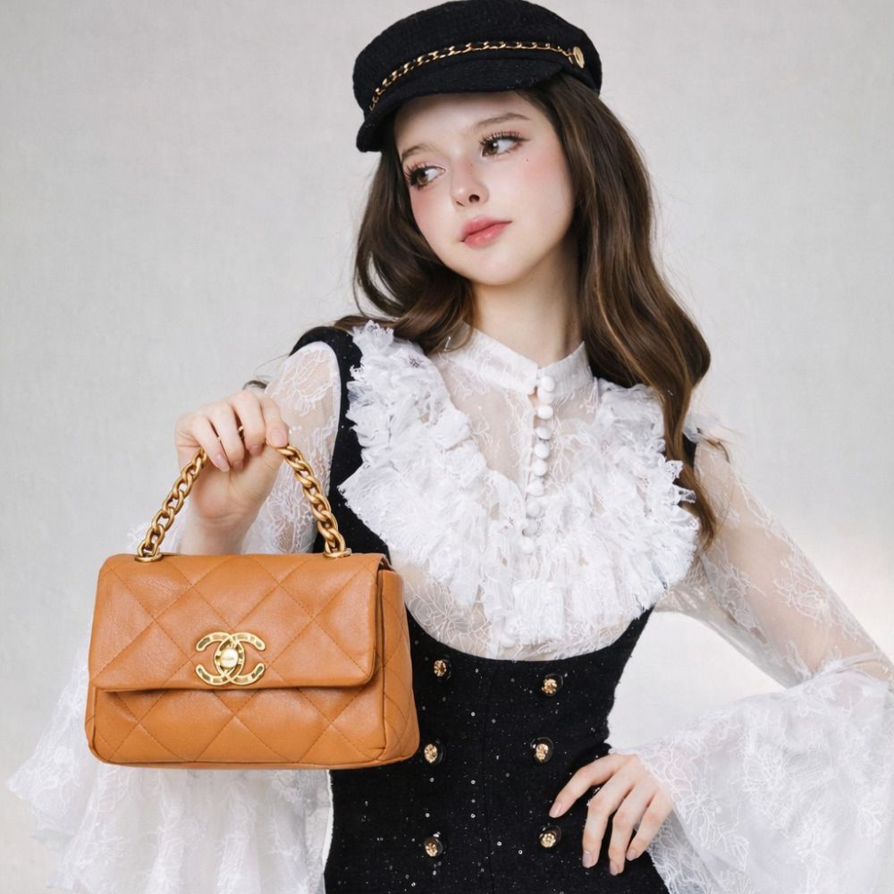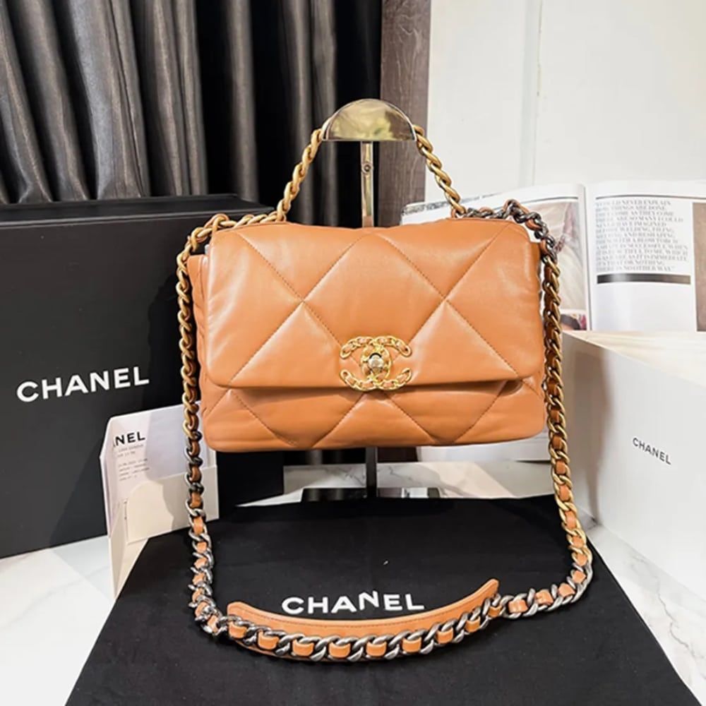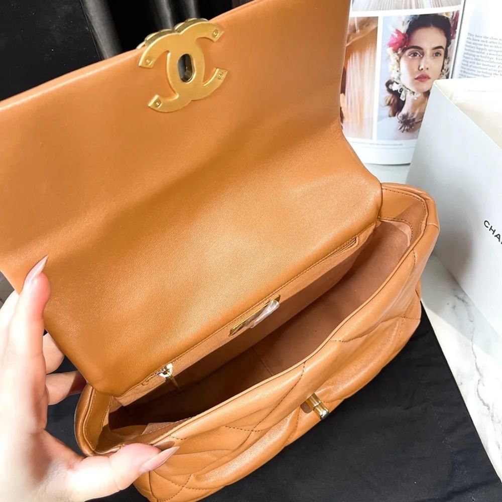 - The Chanel 19 Small Flap Bag in Caramel is a sophisticated piece crafted from supple caramel-toned leather. Featuring the iconic diamond quilting, oversized CC logo, and mixed metal chain, this 25cm bag perfectly balances modern style with timeless elegance.