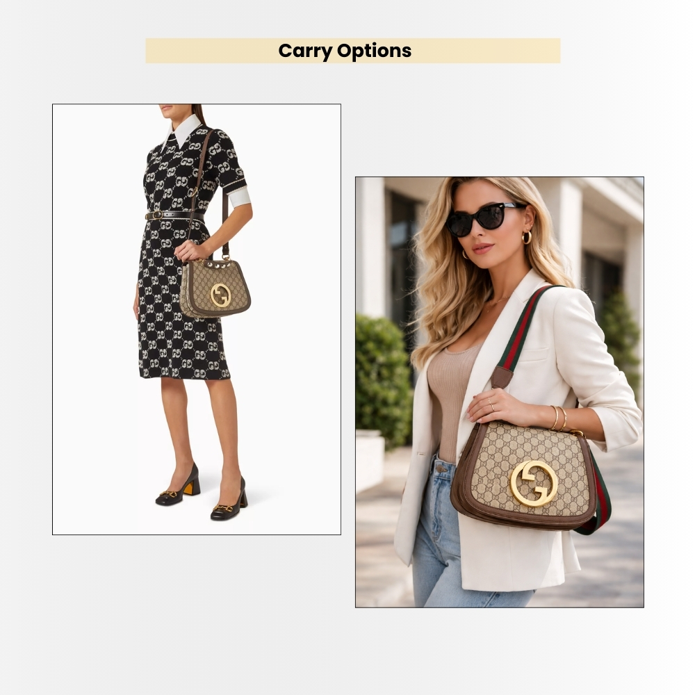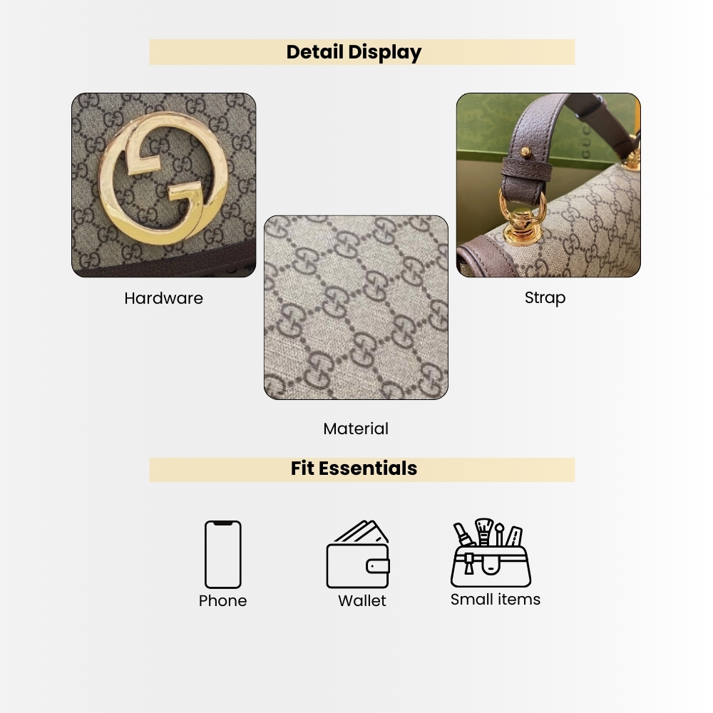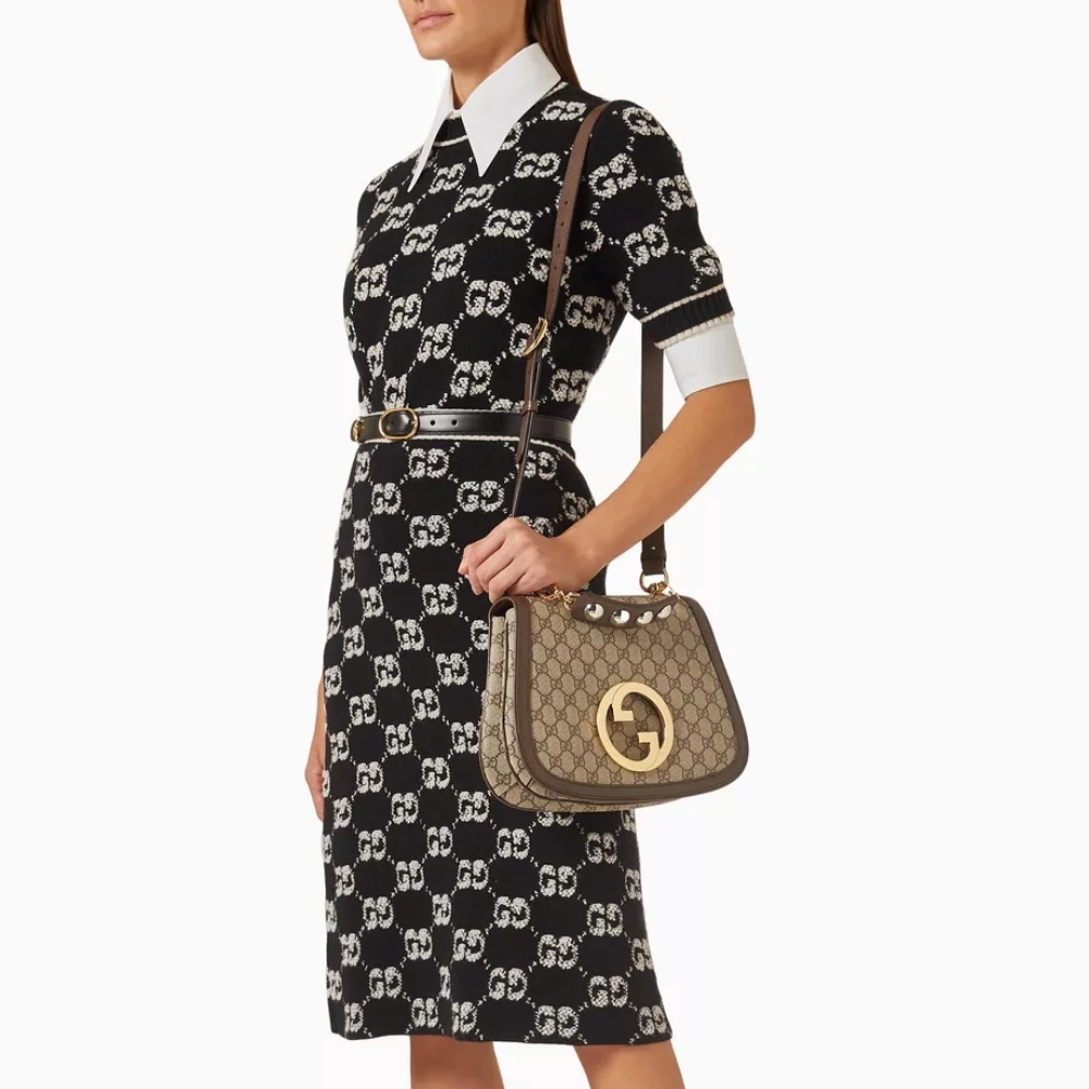 - Influenced by the Gucci archives, this Blondie medium top handle bag puts the geometrically-shaped version of the Interlocking G logo at its center. Take note of the gold-toned hardware, two main compartments, and an internal zip pocket.