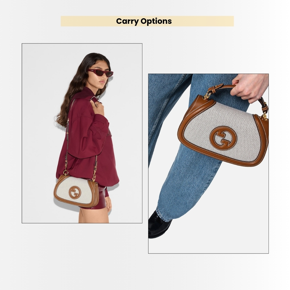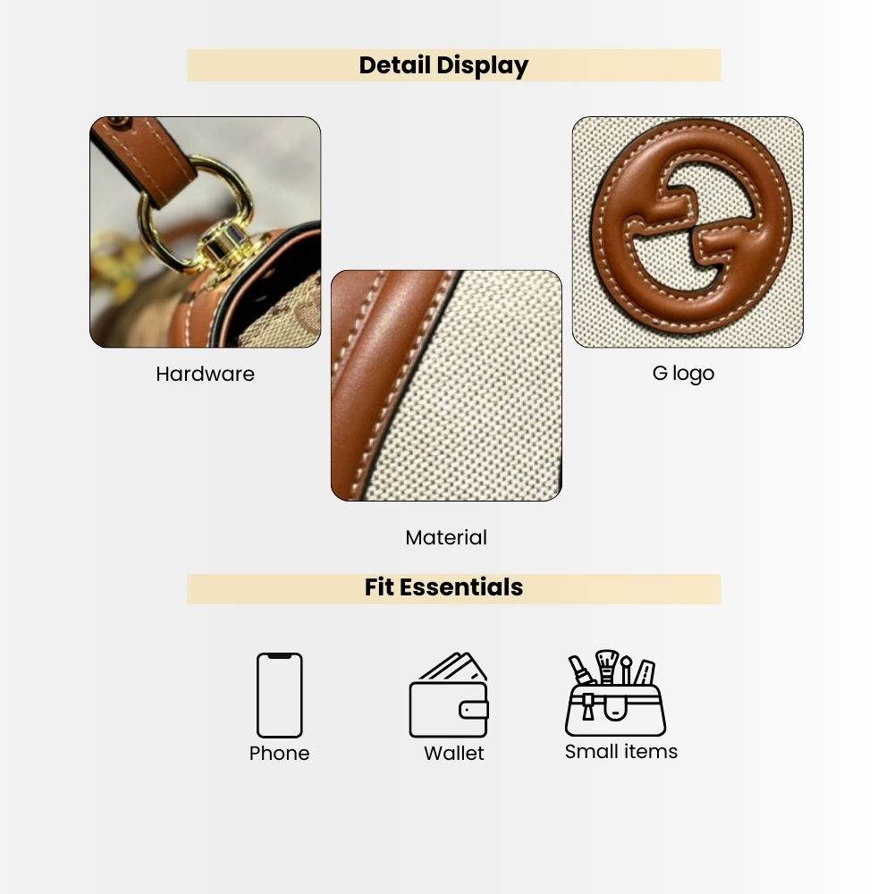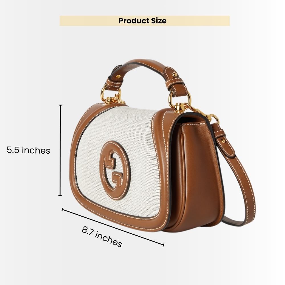 - Gucci Blondie Mini Shoulder Bag in a clean canvas body, framed with warm brown leather trim and contrast stitching for a structured, refined silhouette. The raised Interlocking G leather emblem adds a signature finish, complemented by gold-tone hardware for a polished look.