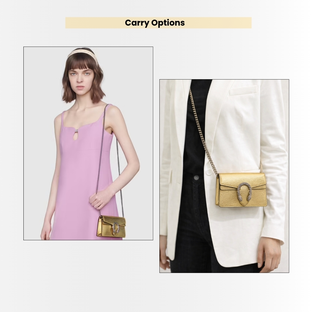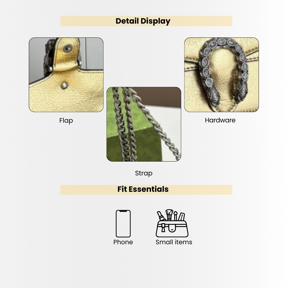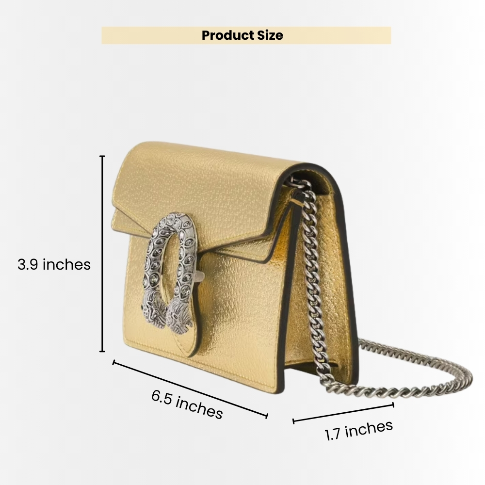 - The Gucci Dionysus Shoulder Bag is crafted from luxurious gold patent leather, boasting a distinctive, glossy finish. Its sleek rectangular silhouette is accented with the signature Dionysus hardware, a silver-tone snake head closure, creating a bold, elegant statement. The compact design is perfect for an evening out or a stylish daytime look.