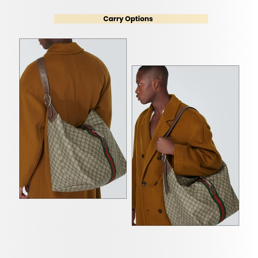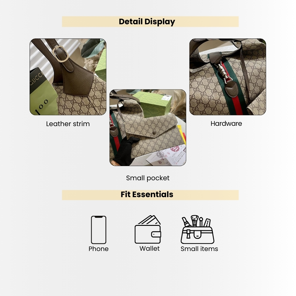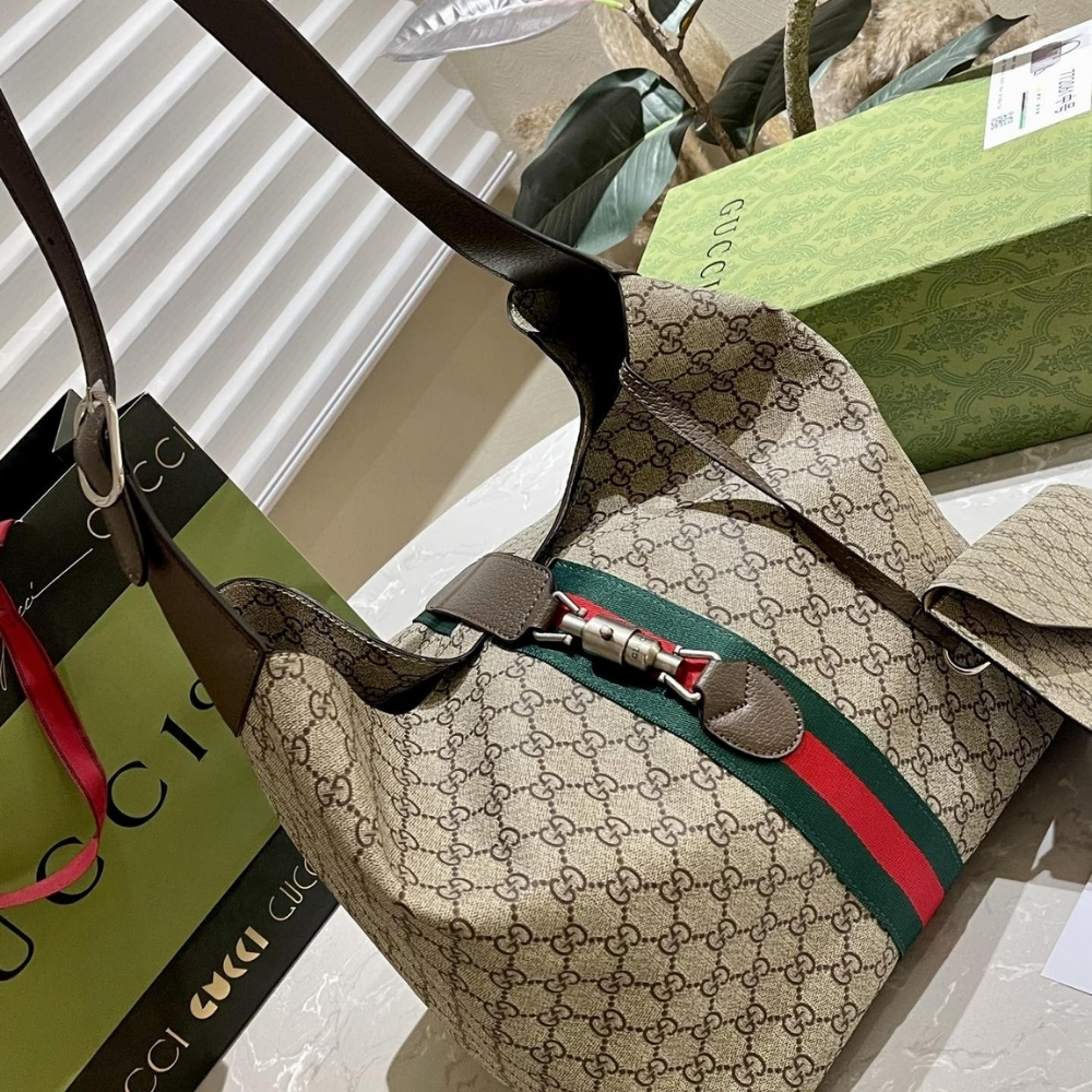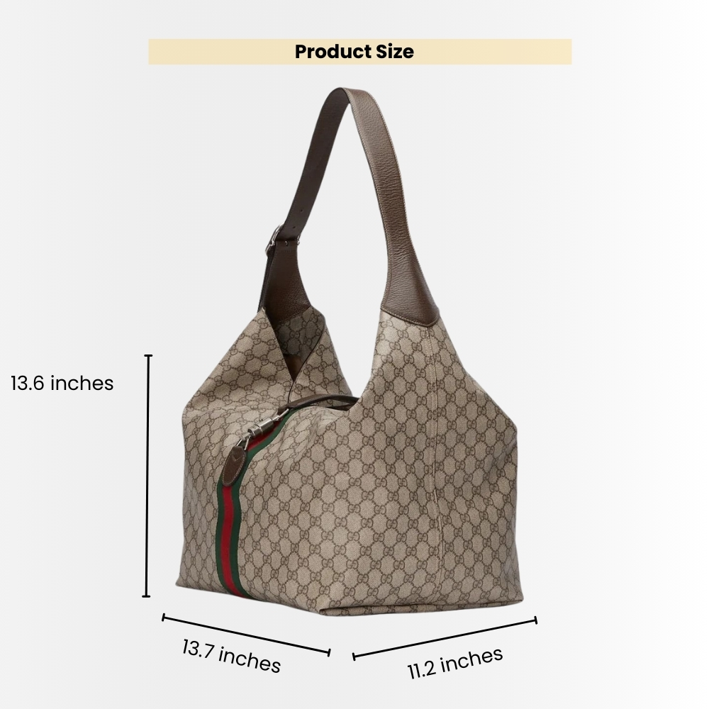 - Gucci Jackie 1961 Medium Shoulder Bag  features a relaxed hobo silhouette crafted in signature GG Supreme canvas, finished with the iconic green-red Web stripe and refined brown leather trim. A sleek top-zip closure and polished metal accents complete the look with a timeless, everyday-luxe feel.
