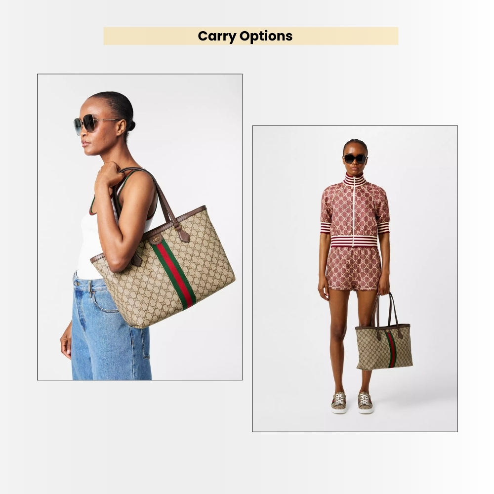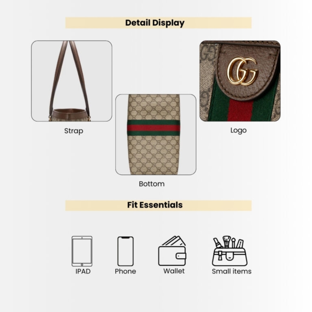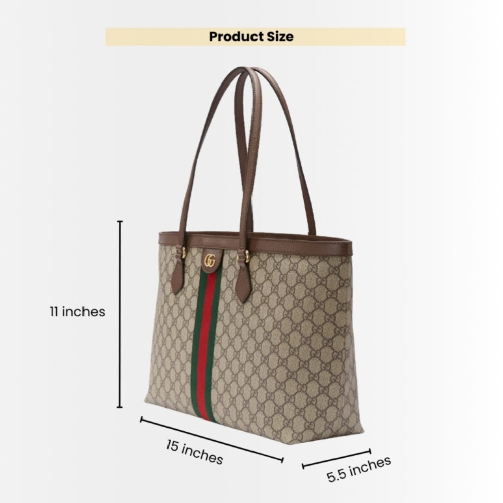 - This Gucci Ophidia Large Tote in beige and dark brown GG Supreme is the perfect combination of elegance and functionality. The 38 cm size provides ample space for all your essentials, while the iconic GG design ensures it stands out as a luxury piece.