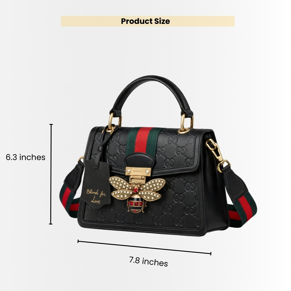 - A structured top-handle silhouette crafted from signature GG Supreme canvas with pebbled leather trim, finished with antique gold-tone hardware. The front clasp is accented by the iconic bee motif, complemented by the green-red web stripe and “Blind for Love” tag.
