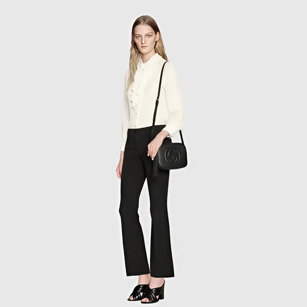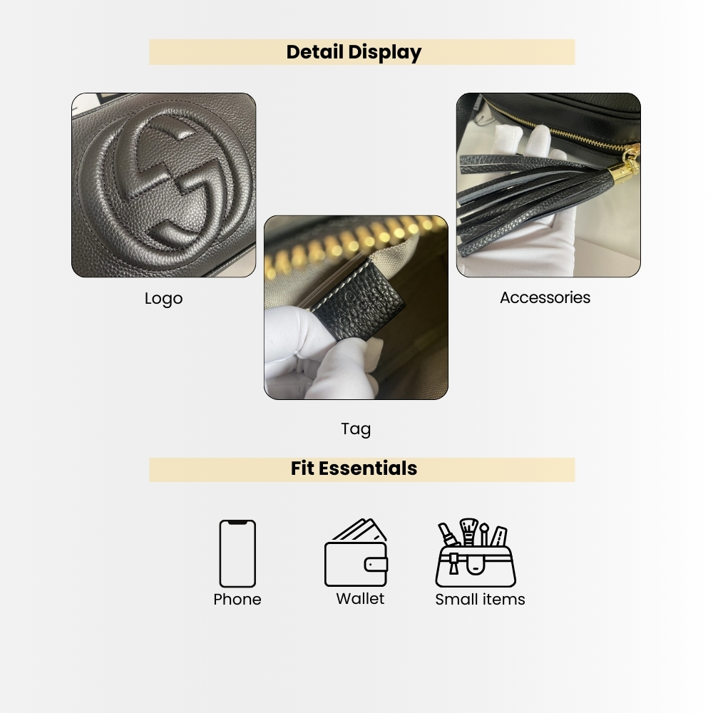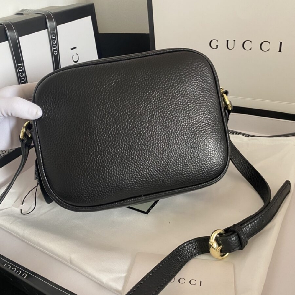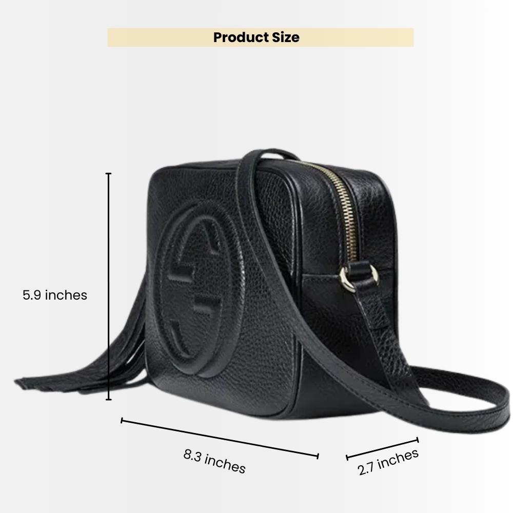 - Gucci Soho Leather Disco Bag with Interlocking G (Black) is crafted in grained leather with a clean camera-bag silhouette, finished with the signature embossed Interlocking G and a tassel zip pull. Sleek, compact, and quietly iconic, it’s designed to carry the essentials with polished ease.