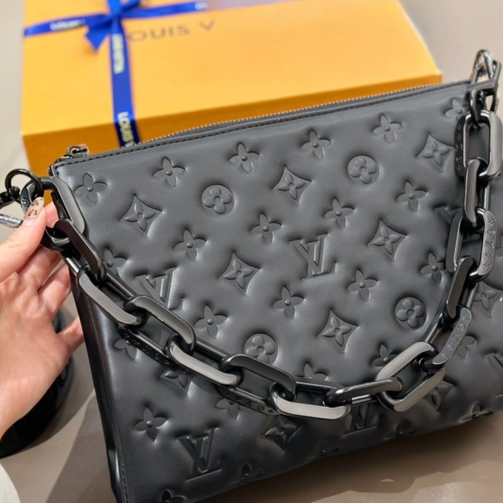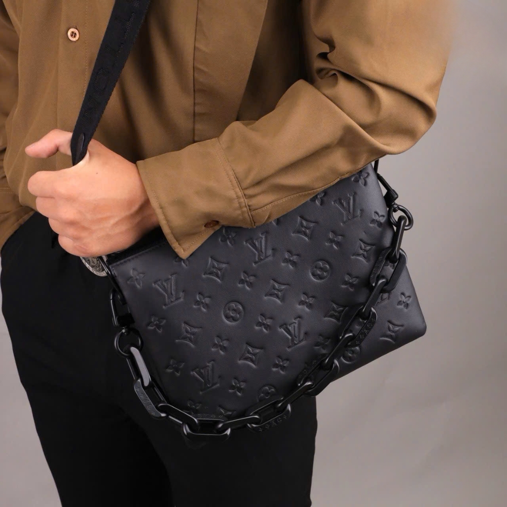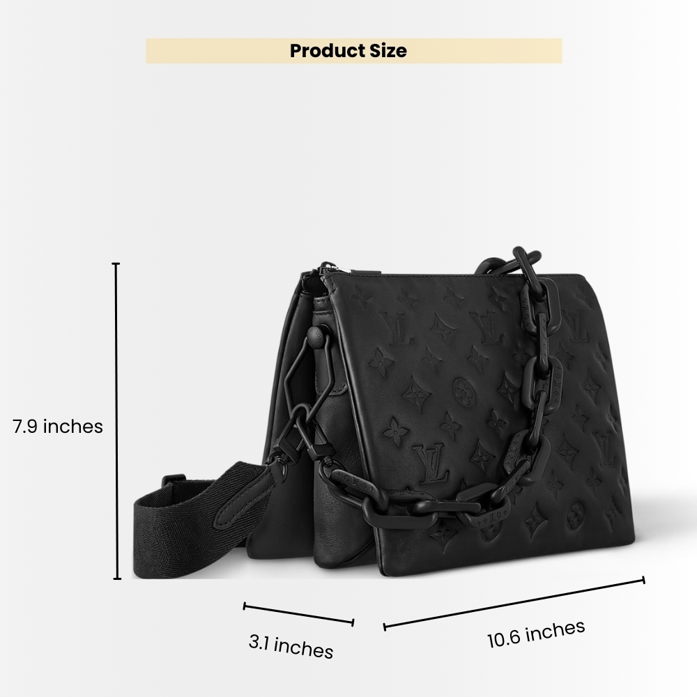 - The Black Out collection presents this monochromatic edition of the Coussin PM, crafted from smooth matte leather embossed with Monogram motifs. It is elevated with tonal hardware, including a removable chunky LV chain for an additional carry option. The versatile design is fitted with a secure zip closure and offers plenty of room to store everyday essentials.