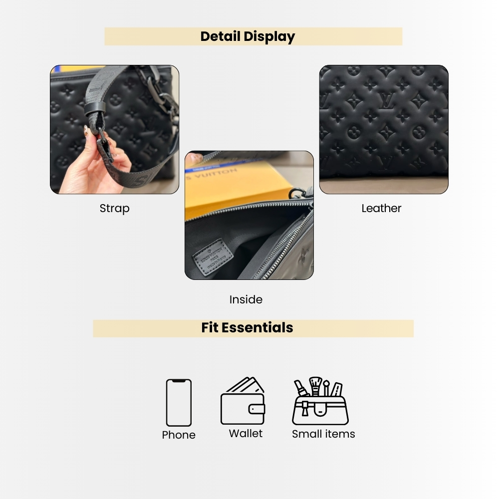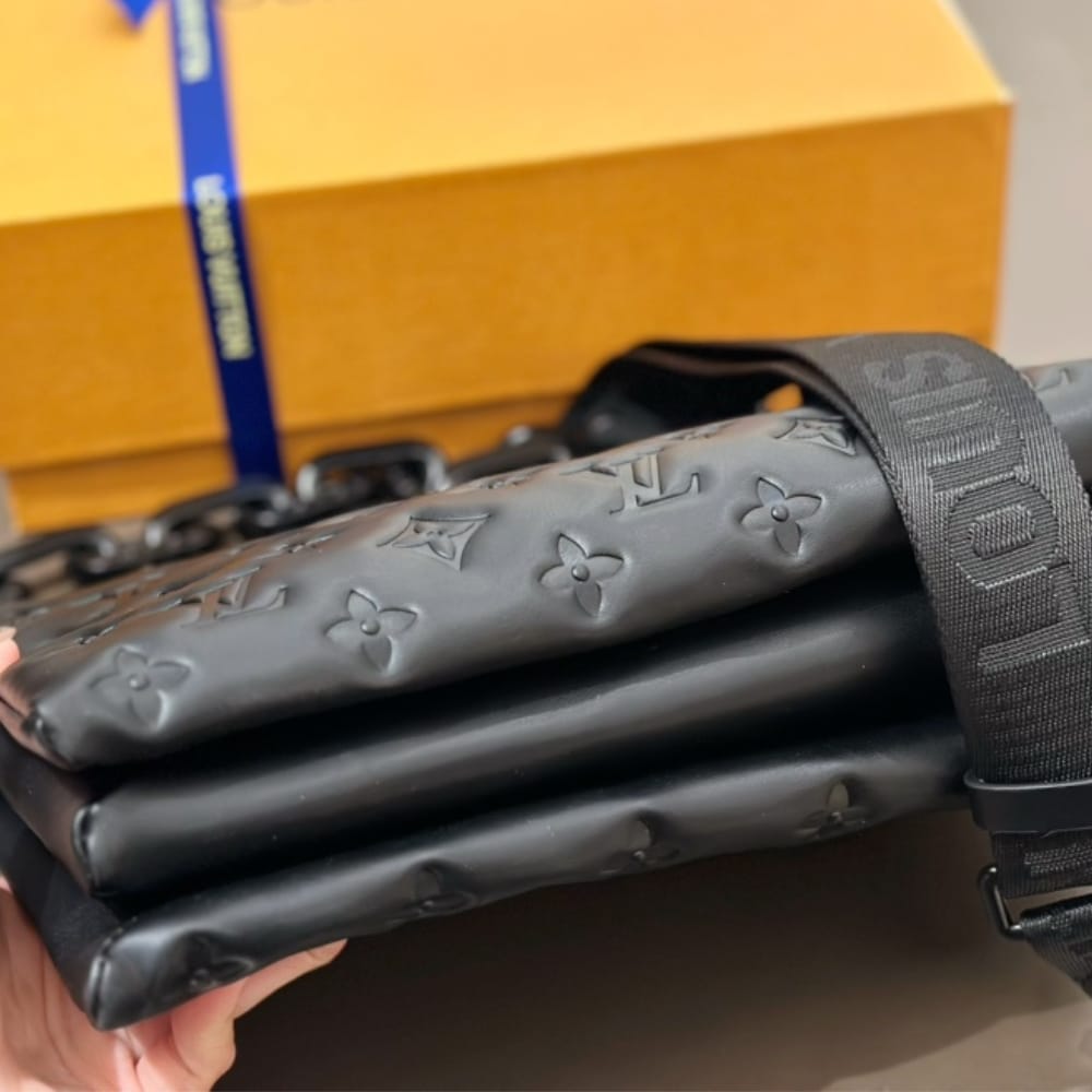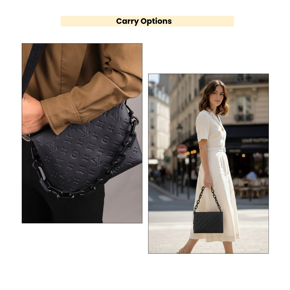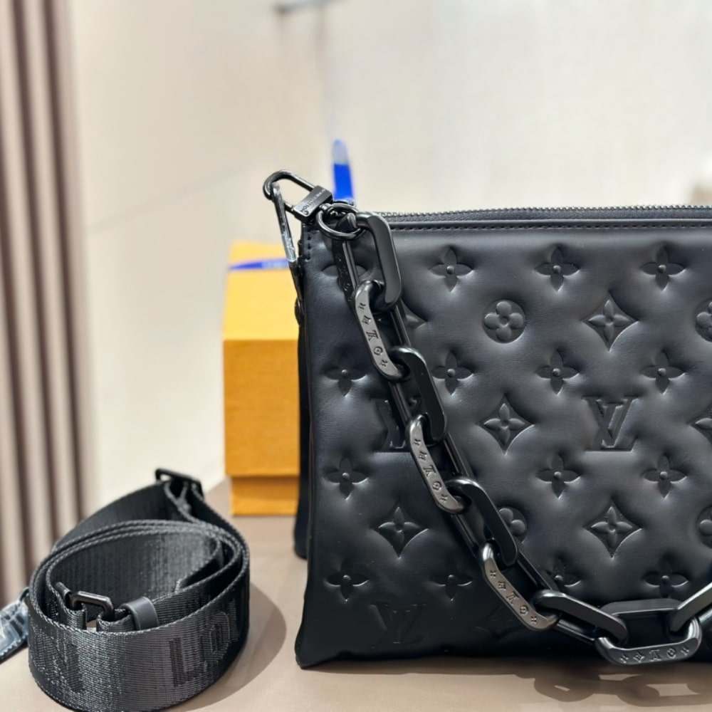 - The Black Out collection presents this monochromatic edition of the Coussin PM, crafted from smooth matte leather embossed with Monogram motifs. It is elevated with tonal hardware, including a removable chunky LV chain for an additional carry option. The versatile design is fitted with a secure zip closure and offers plenty of room to store everyday essentials.