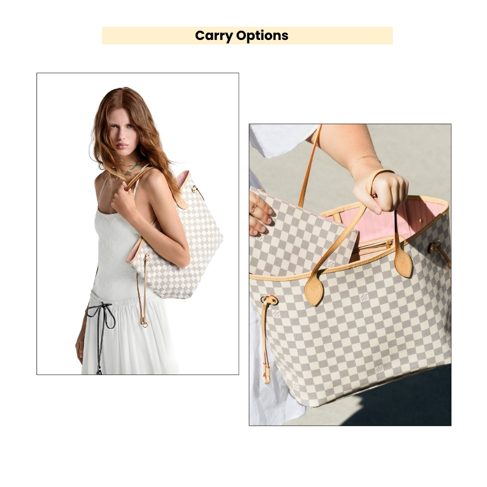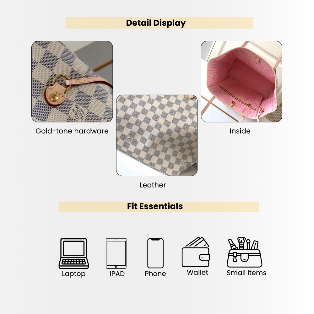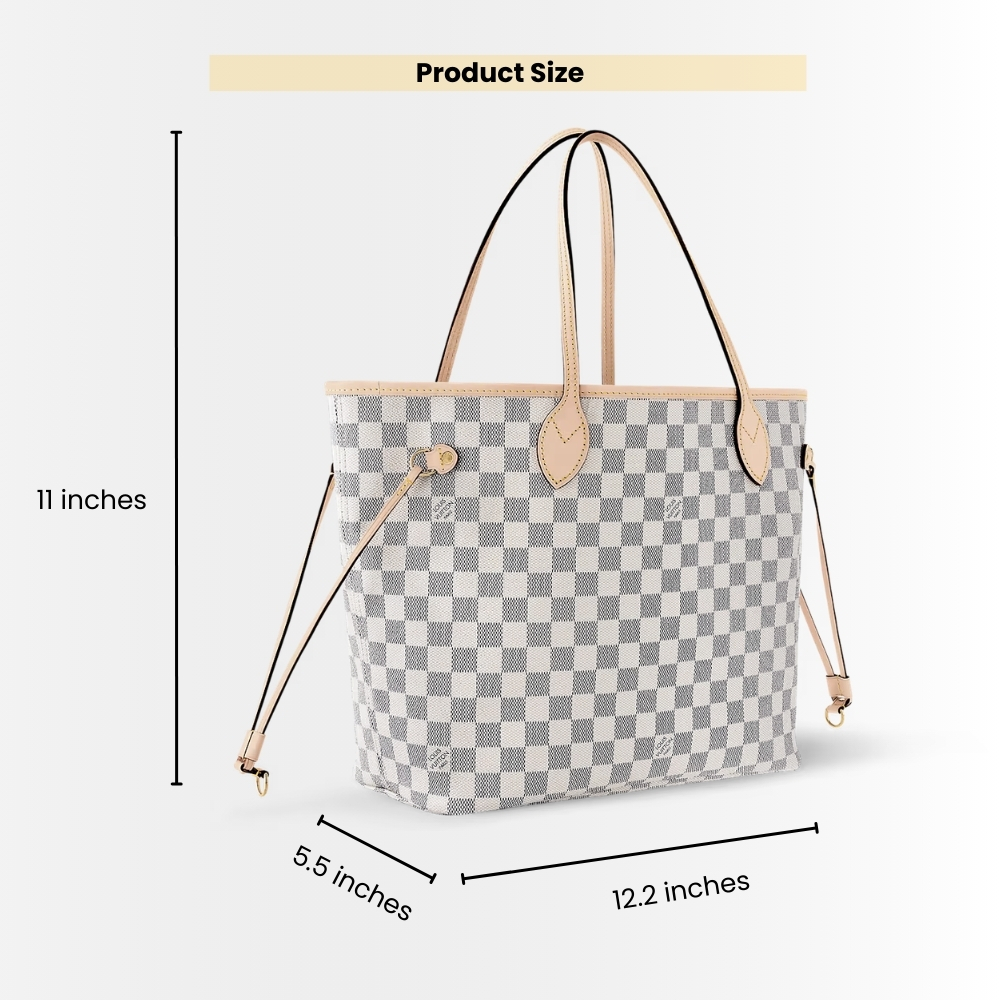 - Blending elegant design with heritage flair, the Neverfull MM bag is crafted from Damier Azur Canvas, accented with natural cowhide leather and a striking woven lining. It boasts ample capacity and adjustable side straps. The slender handles offer comfortable carrying, while the detachable pouch can be used as a clutch or a secondary compartment.