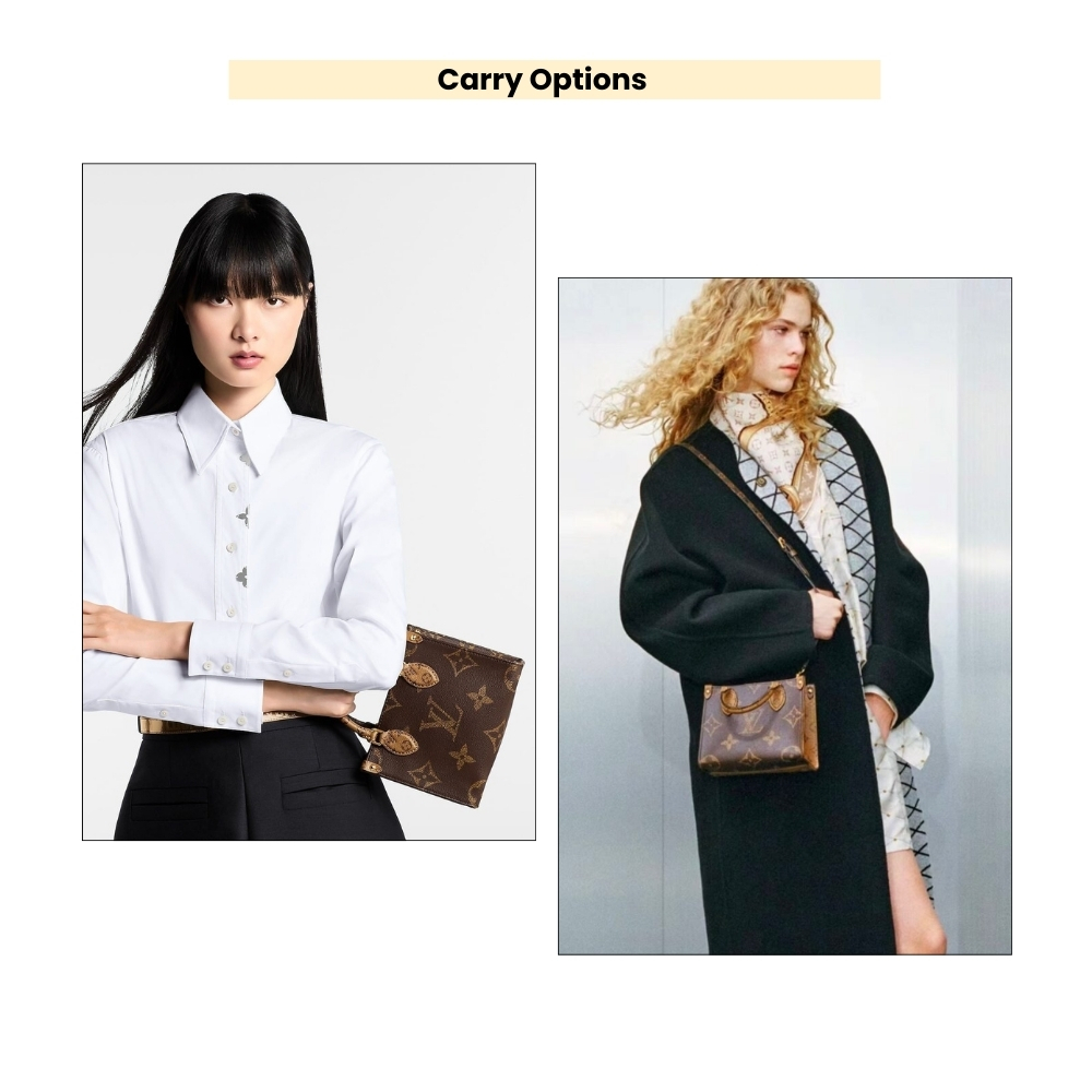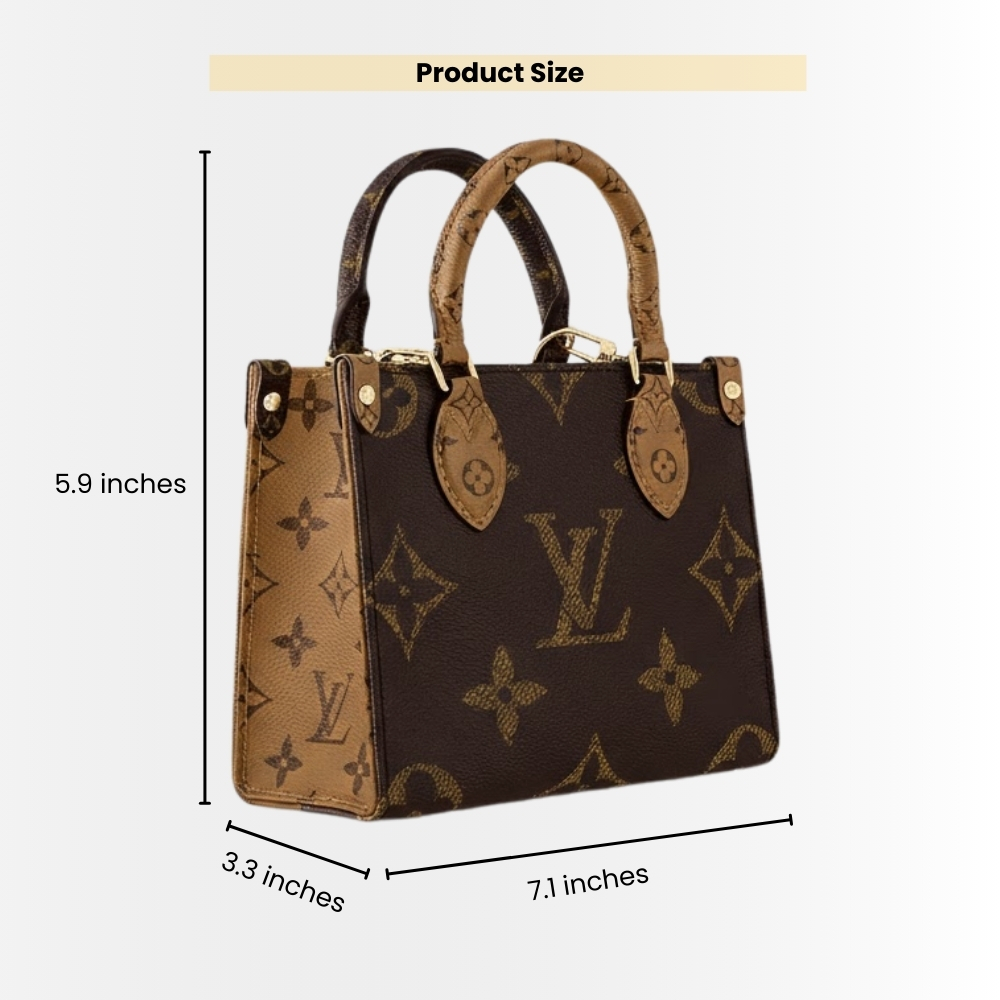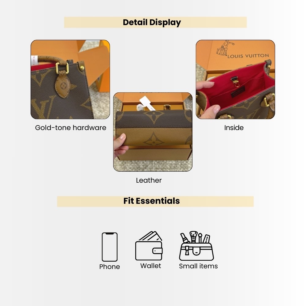 - The smaller version of the OnTheGo bag is crafted from Monogram Canvas, combined with leather handles and handle connectors featuring the Monogram Reverse pattern. This compact bag retains all the signature details of the OnTheGo and is spacious enough to hold a phone. In addition to the double handles, the design also includes a detachable and adjustable shoulder strap.