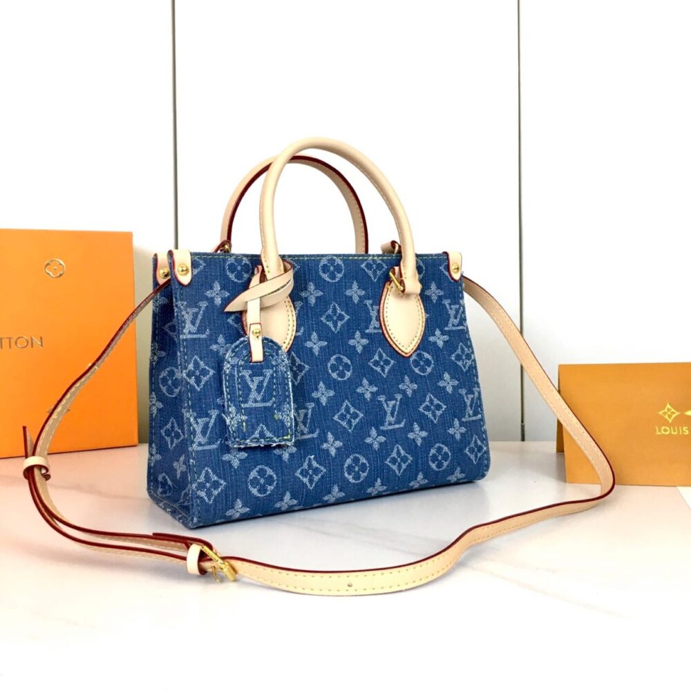 - This OnTheGo PM showcases the return of the House’s iconic Monogram denim, accented with signature leather trims. The versatile handbag is refined with gold-tone hardware and secures with a magnetic flap closure. Sized to store a tablet amongst other everyday essentials, it can be carried by hand or worn cross-body thanks to the removable strap.