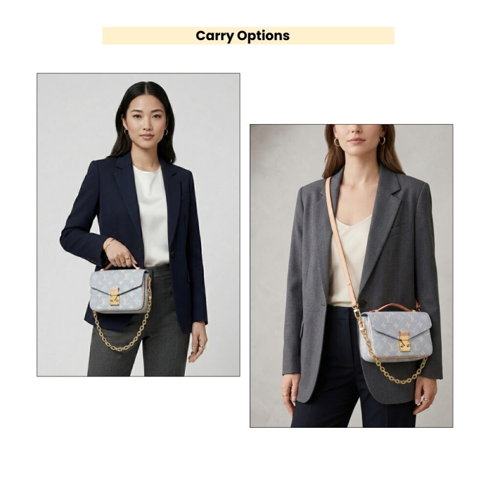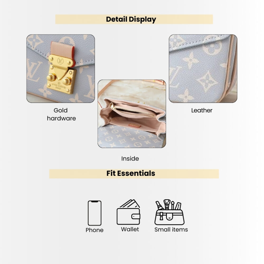 - Made from Coated canvas with natural-leather trim and the S-lock signature, the Pochette Métis East West bag combines emblematic House cues with new contemporary details like a gold-color chain for fashionable short-shoulder carry. Roomy enough to store a smartphone, it has three inside compartments, a zipped pocket inside, and another outside.