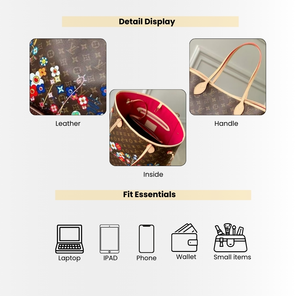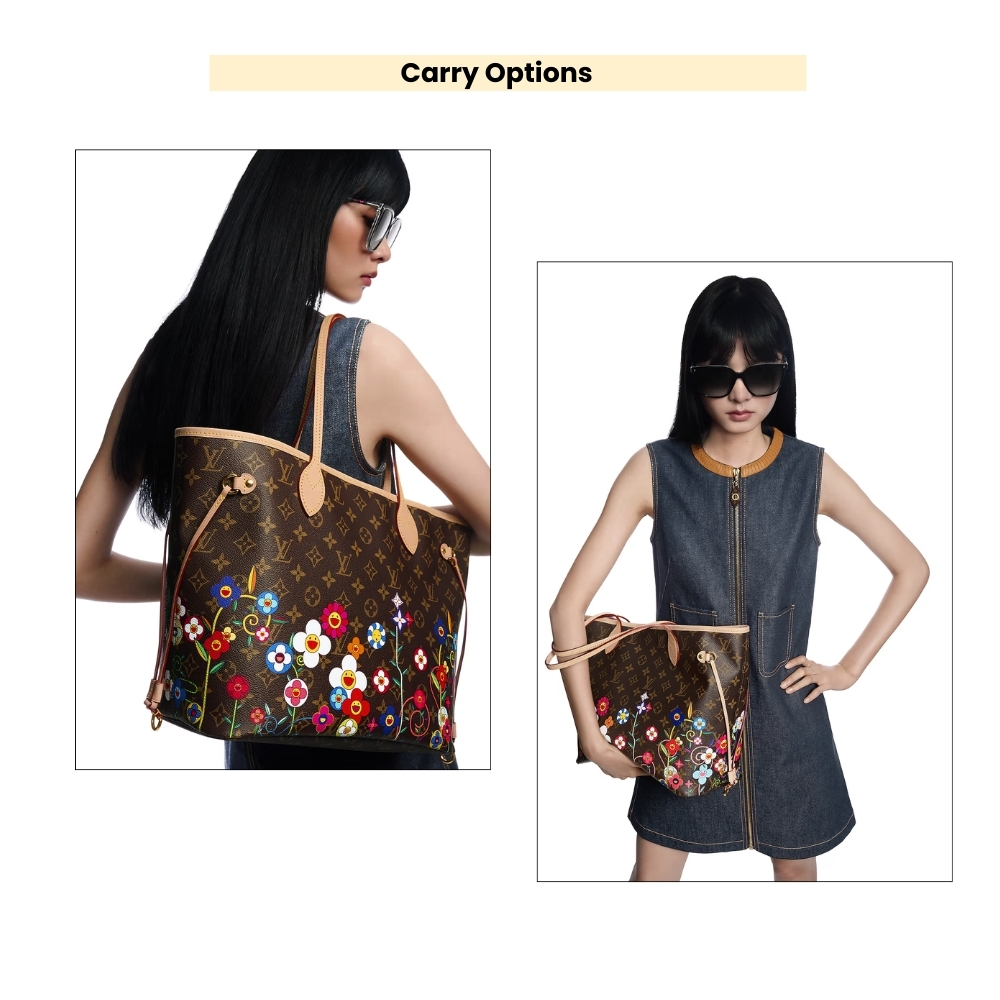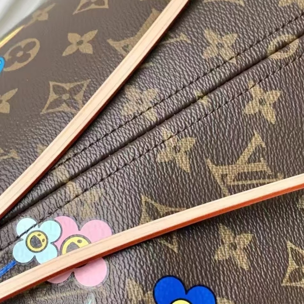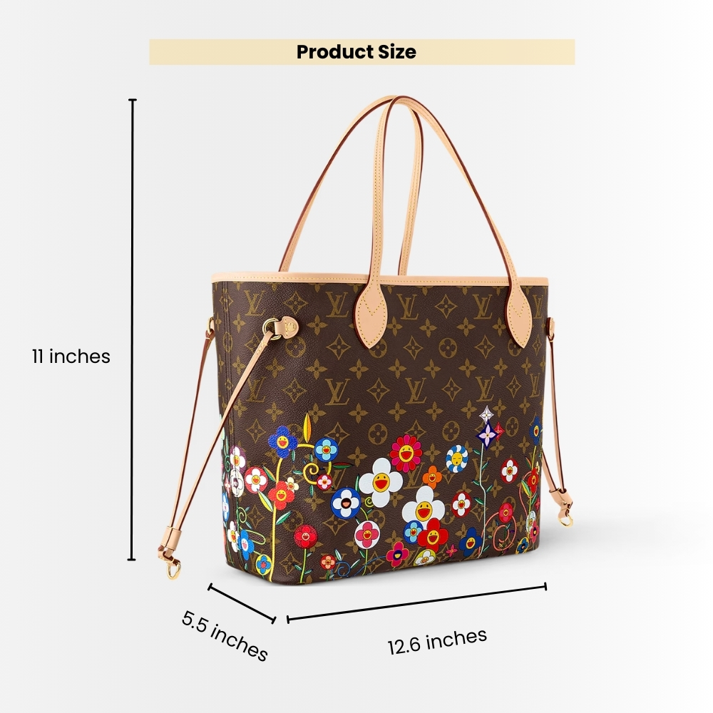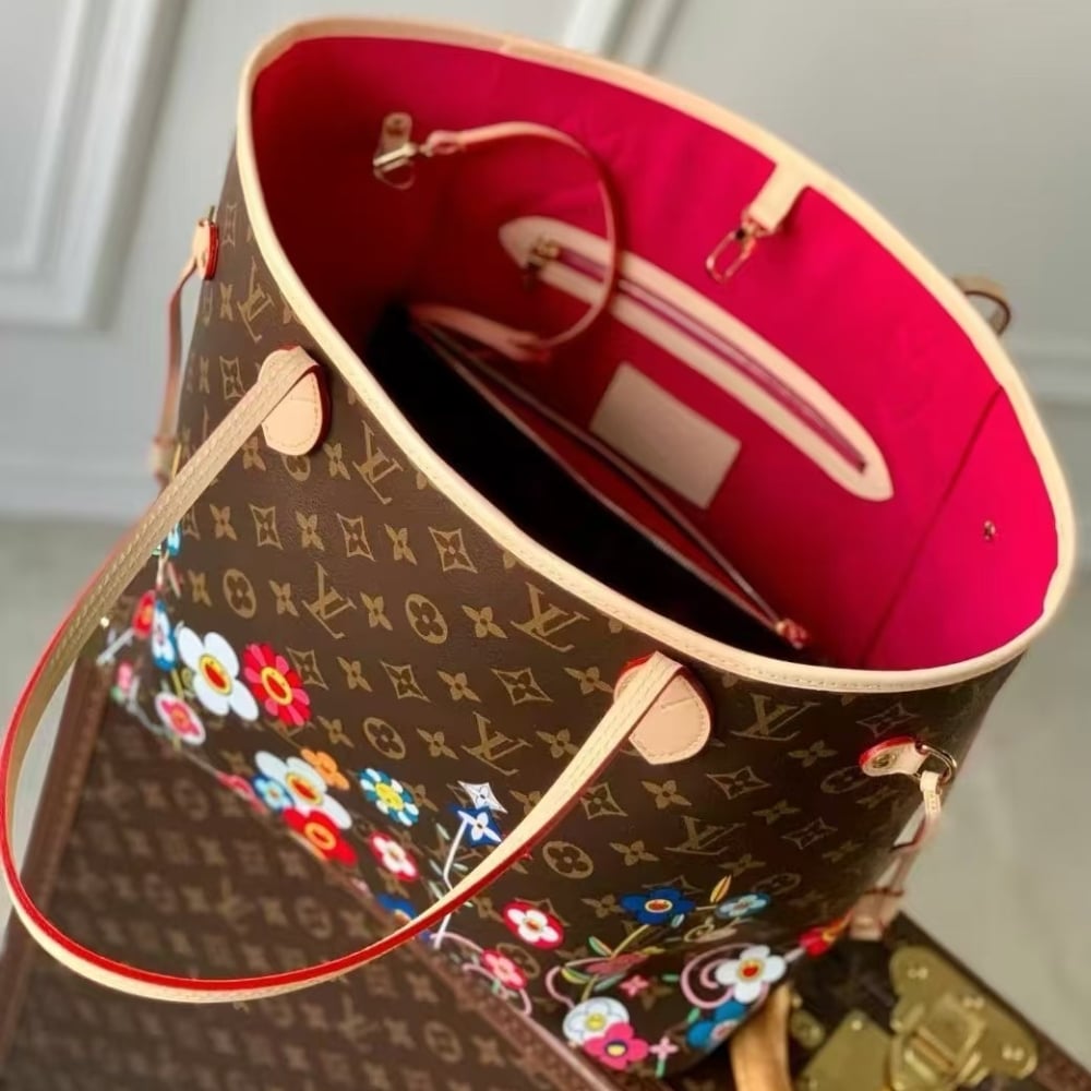 - This timeless Neverfull MM handbag combines two iconic signatures as part of the celebratory re-edition of the Louis Vuitton x Murakami collection. The spacious Monogram canvas body is playfully overlaid with Monogram Flowers that have been reworked in Takashi Murakami’s renowned superflat aesthetic. Natural leather highlights the top, the handles and the side ties, while the inside is lined with colorful striped fabric. Complete with a zipped interior pocket and a removable pouch.